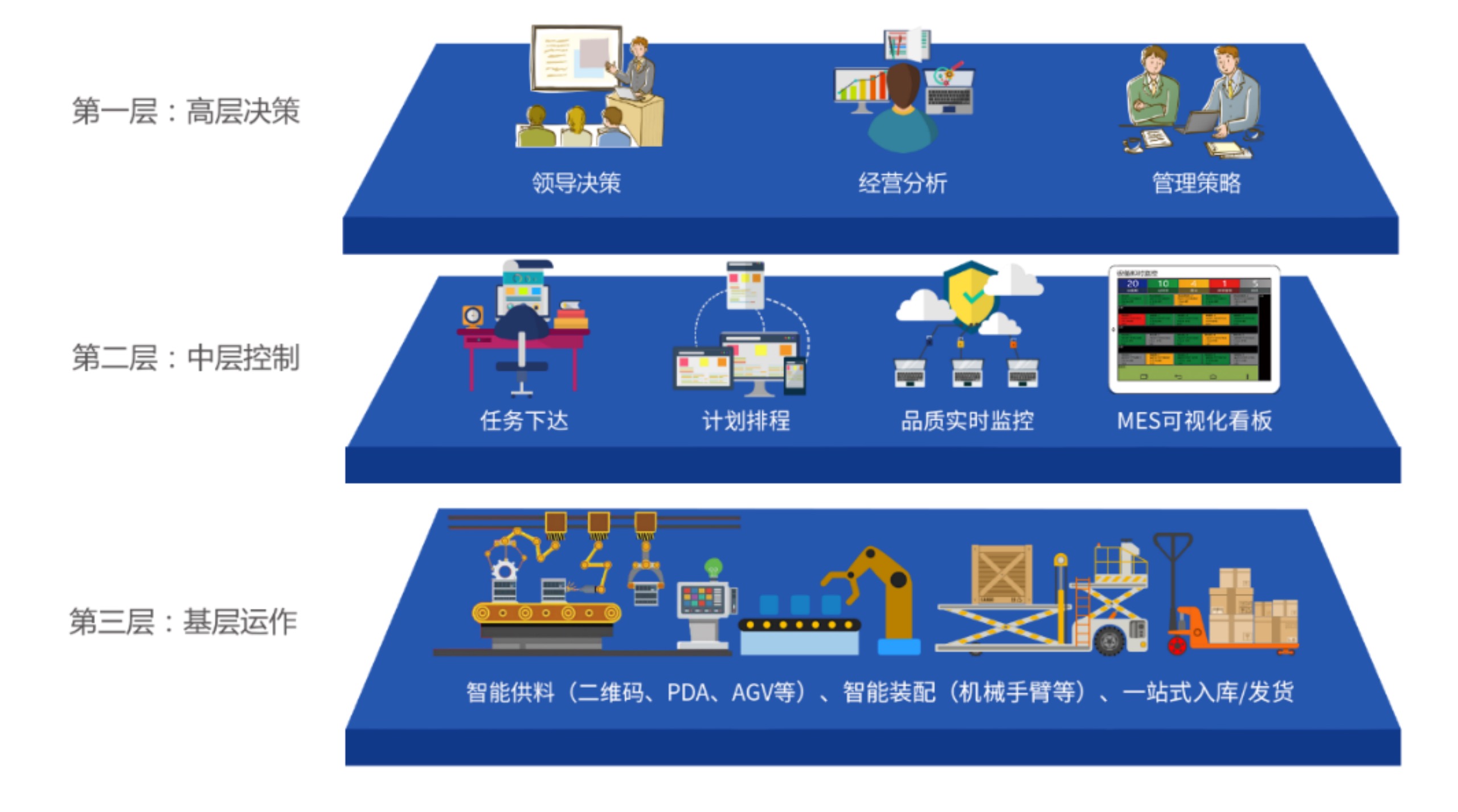 智能制造管理解决方案,融合当代的先进技术,与智能物流、WMS、MES无缝整合,并利用大数据分析、物联网技术等,助力制造企业打造从高层决策、到中层控制,到基层运作的高效、智能运营模式。推动传统制造业企业实现从传统到创新的管理转变,从人工到智能的生产转变, 实现从“制造”向“智造”的新突破 。