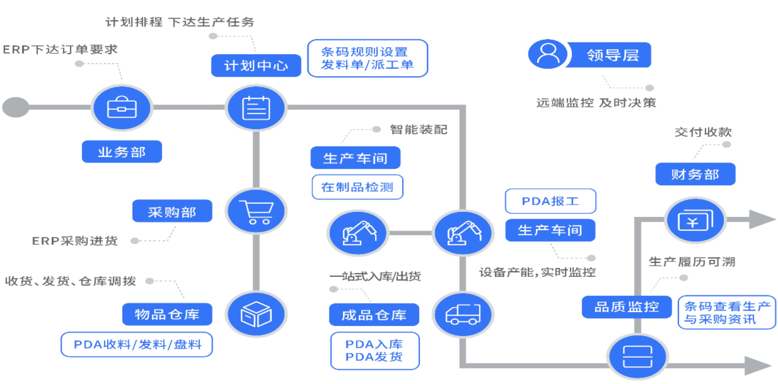 我们融合当代的先进技术,与WMS、MES无缝整合,并利用大数据分析、物联网技术等,帮助企业打造新“智造”的生产管理,提升生产效能,及时反馈车间动态,让生产进度尽在掌握之中。