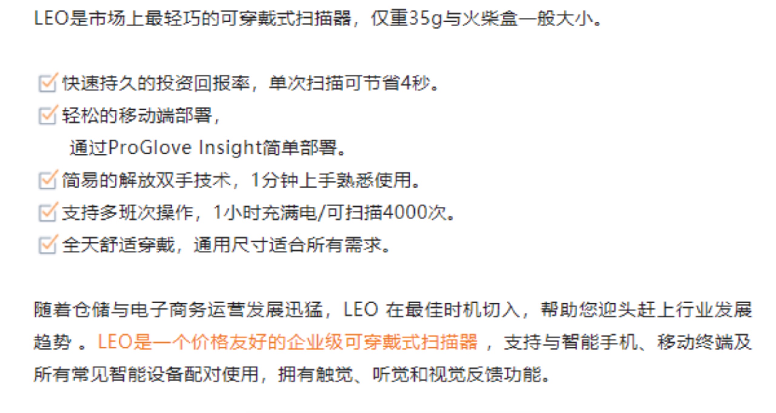 概述:LEO是市场上最轻巧的可穿戴式扫描器,仅重35g与火柴盒一般大小。