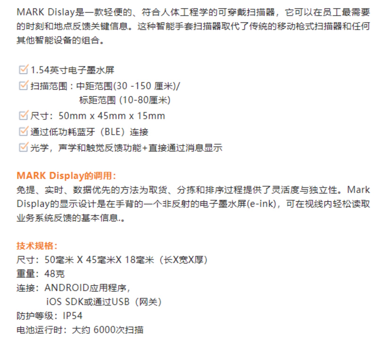 概述:MARK Dislay是一款轻便的、符合人体工程学的可穿戴扫描器,它可以在员工最需要的时刻和地点反馈关键信息。这种智能手套扫描器取代了传统的移动枪式扫描器和任何其他智能设备的组合。